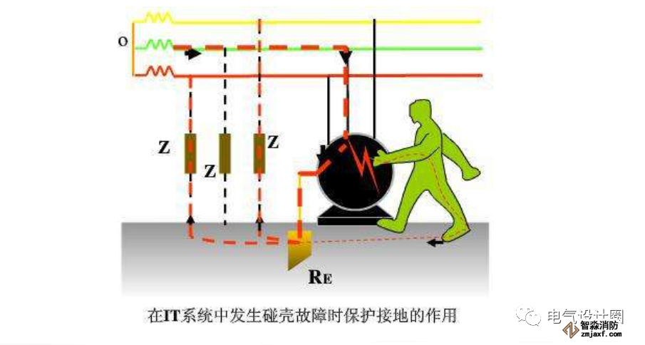 电源侧(如10/0.4kV变压器的低压侧中性点)N线和PE线是连在一起形成PEN,当引向配电系统或用电设备时,也是连在一起。图2中,左下边虚线框可以理解为配电设备,只是在设备处把N线和PE线分开;右下边虚线框可以理解为电动机,从PEN线上分出了一根PE线。