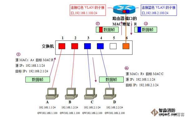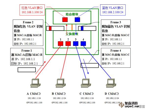 路由模块在收到数据帧时,先由数据帧附加的VLAN识别信息分辨出它属于红色VLAN,据此判断由红色VLAN接口负责接收并进行路由处理。因为目标网络192.168.2.0/24是直连路由器的网络、且对应蓝色VLAN;