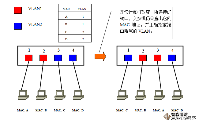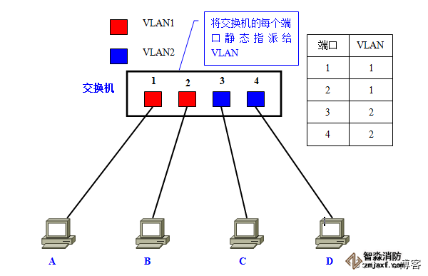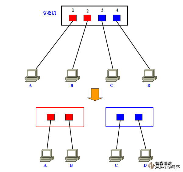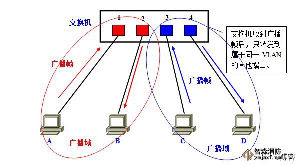 这时,如果在交换机上生成红、蓝两个VLAN;同时设置端口1、2属于红色VLAN、端口3、4属于蓝色VLAN。再从A发出广播帧的话,交换机就只会把它转发给同属于一个VLAN的其他端口——也就是同属于红色VLAN的端口2,不会再转发给属于蓝色VLAN的端口。