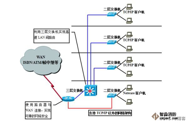 利用在各楼层配置的二层交换机定义VLAN,连接TCP/IP客户计算机。各楼层间的VLAN间通信,利用三层交换机的高速路由加以实现。如果网络环境要求高可靠性,还可以考虑冗余配置三层交换机。
