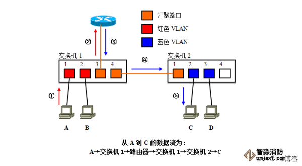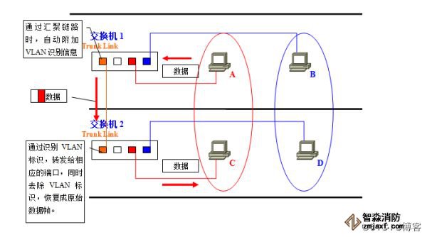 ①、A发送的数据帧从交换机1经过汇聚链路到达交换机2时,在数据帧上附加了表示属于红色VLAN的标记。
