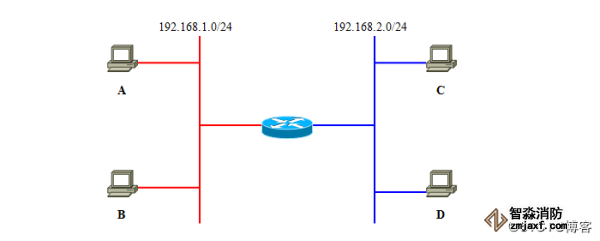 图中的路由器,带有2个LAN接口。左侧的网络是192.168.1.0/24,右侧是192.168.2.0/24。