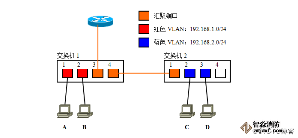 接下来再假设有一个由1台路由器、2台交换机构成的“使用VLAN”的局域网。交换机与交换机、交换机与路由器之间均为汇聚链路;并且假设192.168.1.0/24对应红色VLAN、192.168.2.0/24对应蓝色VLAN。