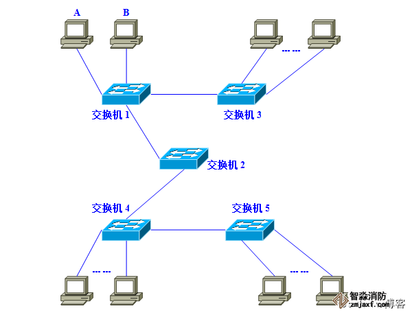图中,是一个由5台二层交换机(交换机1~5)连接了大量客户机构成的网络。假设这时,计算机A需要与计算机B通信。在基于以太网的通信中,必须在数据帧中指定目标MAC地址才能正常通信,因此计算机A必须先广播“ARP请求(ARP Request)信息”,来尝试获取计算机B的MAC地址。