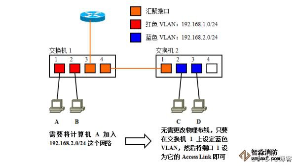 需要将连接在交换机1上192.168.1.0/24这个网段的计算机A转属192.168.2.0/24时,无需更改物理布线。只要在交换机上生成蓝色VLAN,然后将计算机A所连的端口1加入到蓝色VLAN中去,使它成为访问链接即可。