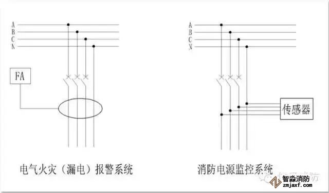 下图可以看出电气火灾监控系统(左)以及消防设备电源监控系统的检测方式(右)