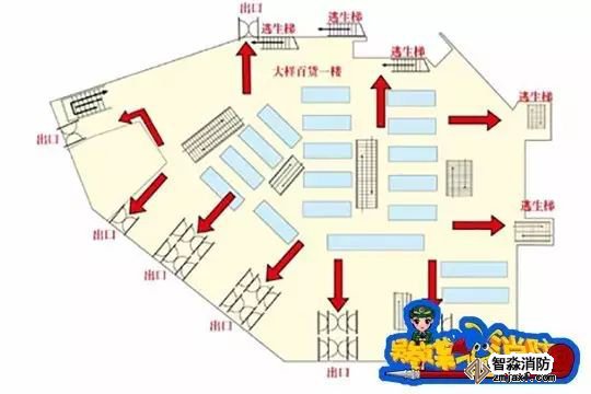 走进商场,应留心看一看逃生疏散路线上的防火门、疏散楼梯、安全出口的位置,以及灭火器、消火栓、报警器的位置,以便有火警时及时逃出危险区。