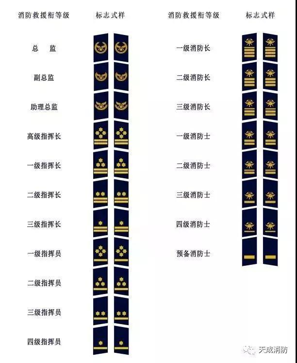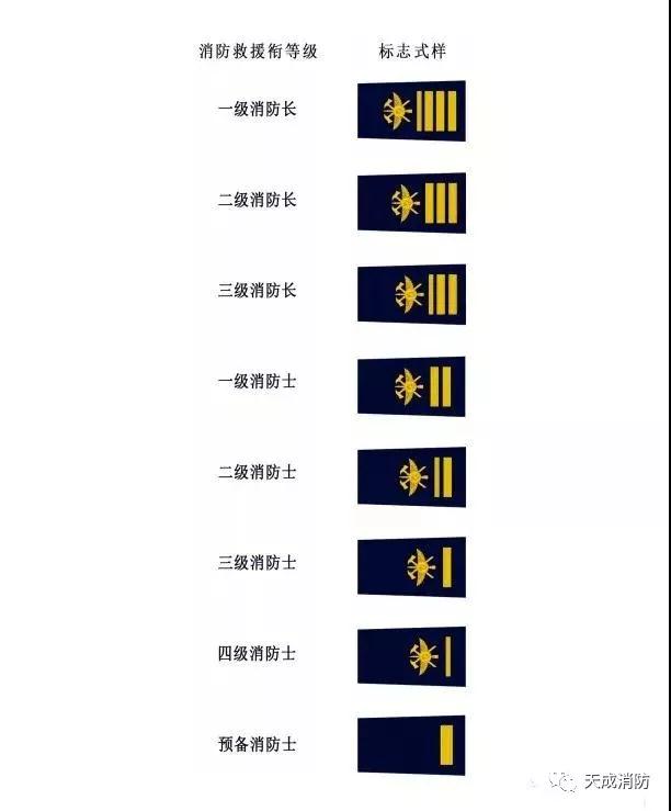 高级消防员衔标志缀钉一枚徽标,一级消防长衔标志缀钉三粗一细四道横杠,二级消防长衔标志缀钉三道粗横杠,三级消防长衔标志缀钉二粗一细三道横杠。
